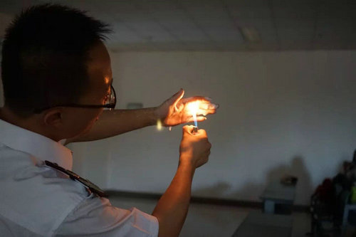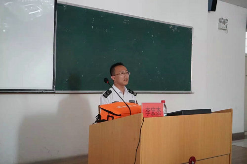李宏杰教官通过“提高检查消除火灾隐患能力、组织扑救突起火灾能力、组织人员疏散逃生能力、消防宣传教育培训能力”等四个方面进行讲解。举出了历年火灾发生数目,以及火灾案例。配上了一幅幅触目惊心的图片,和一段段引人深省的视频,现场的听众唏嘘不已。他的语言通俗朴实,以不断提问的方式,引发在场老师及同学的思考。他还为同学们全面讲解了灭火器、湿毛巾、防毒防烟面具等消防器材的种类和具体用法,让师生们更深刻的体会到了掌握消防安全知识的重要性。