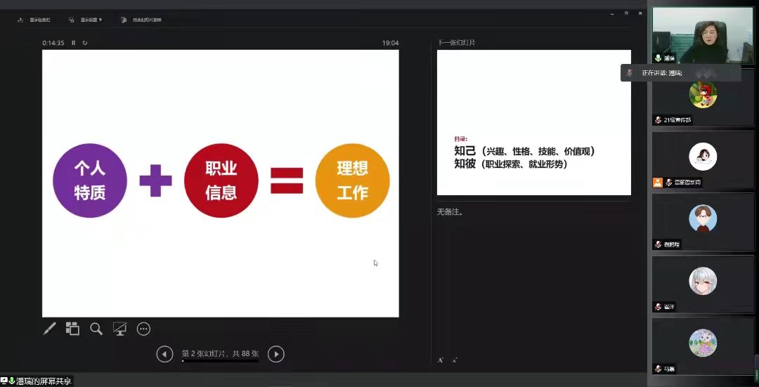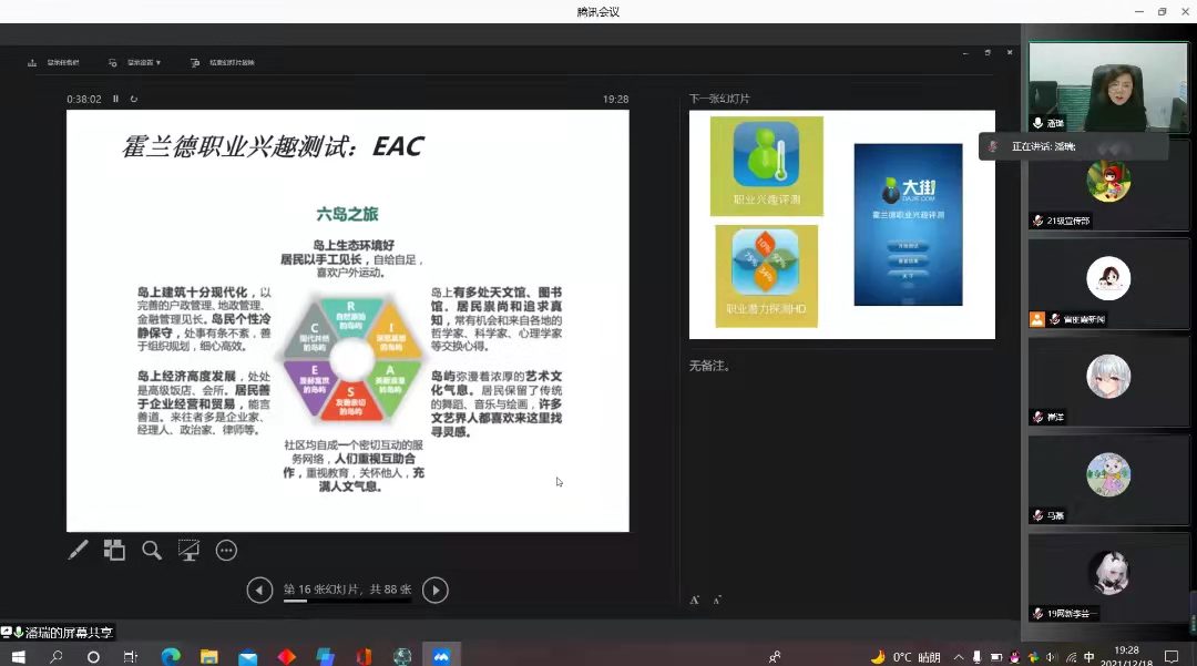 为持续推动党史学习教育走深落实,深入贯彻落实党中央、国务院“稳就业”、“保就业”决策部署,进一步为学生办实事、解难题,12月18日晚,我院于腾讯会议开展以“知己知彼,你准备好了吗”为主题的就业指导专题讲座。本次讲座由学院党总支书记潘瑞主讲,学生工作办公室主任雷丽霞主持,我院2018、2019级本科生,2020级研究生参加。