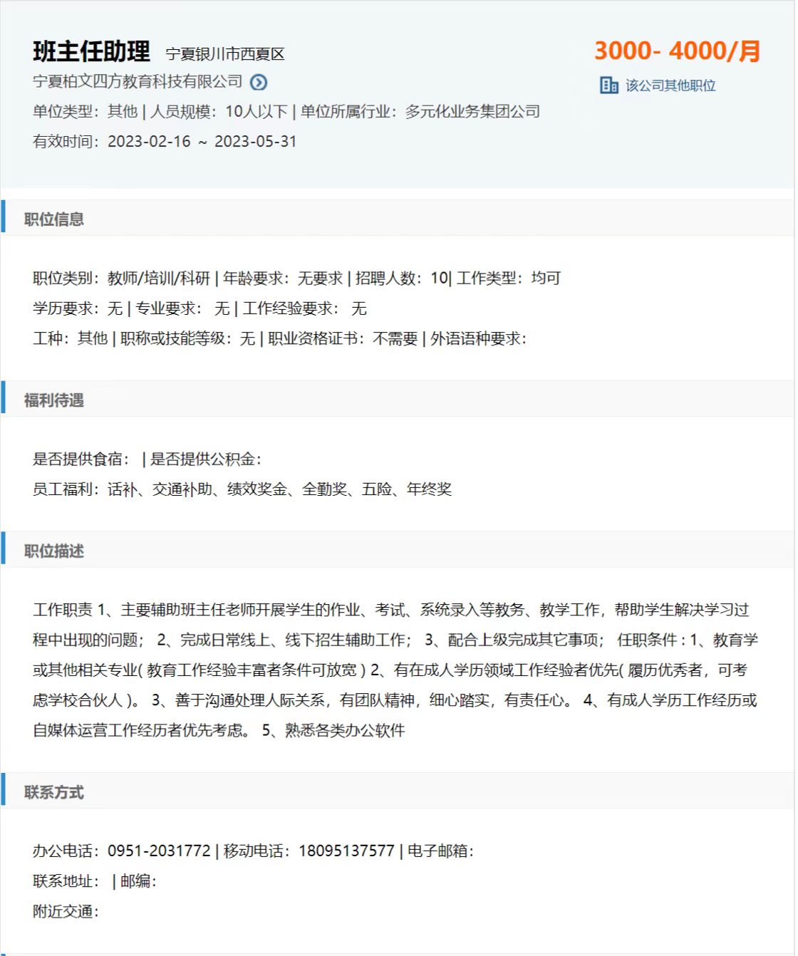 6、岗位:班主任助理