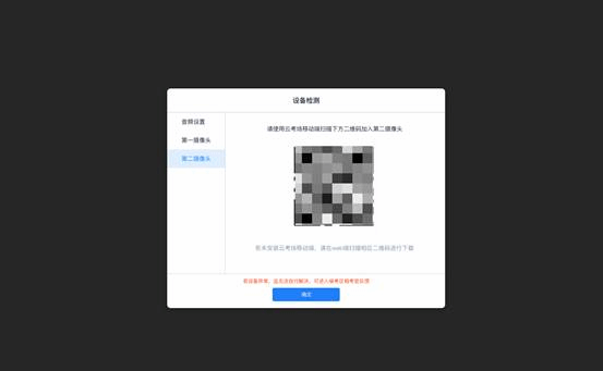 进入候考场之前,考生需要先进行设备检测,包括音频检测、第一摄像头检测和第二摄像头检测。我院使用双摄像头进行面试,考生需要打开云考场移动端扫描该页面提供的二维码加入第二摄像头。