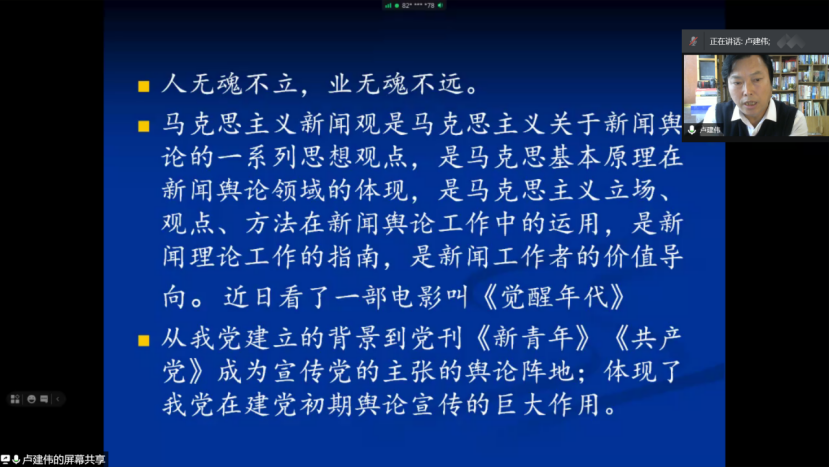 共同承办的2021年马克思主义新闻观讲座第一讲如期举办。本次讲座特邀多次荣获中国广播电视新闻一等奖、辽宁好新闻一等奖,曾连续两届荣获辽宁省好记者讲好故事第一名,大连新闻传媒集团大连电视台91视频记者卢建伟,做“传承红色基因——做党和人民信赖的新闻人”的专题讲座。