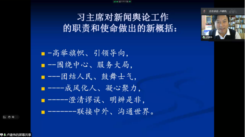 讲座最后,卢建伟结合视频与亲身经历讲述了人民力量的重要性。新闻工作者要与人民建立联系,将人民当亲人,成为人民最信赖的人,才能写出最好的新闻。卢建伟强调,新闻工作者文风要力求“短、实、新”,选题要把握“时、度、效”,要努力成为全媒型、专家型新闻工作者,当好传播者、记录者、推动者、守望者,做最具有人民情怀的记者,党和人民信赖的新闻人。