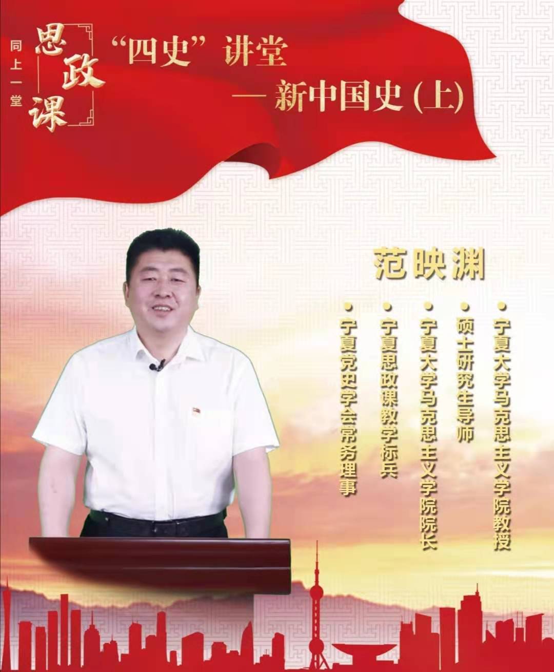 马克思主义学院院长、中国国际共运史学会理事、宁夏党史学会常务理事、宁夏大中小思政课一体化建设专家委员会主任、自治区思政课教学标兵范映渊主讲。