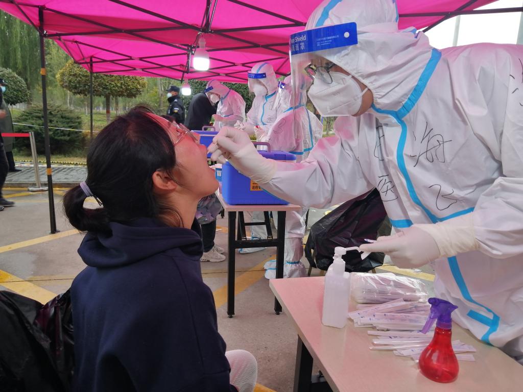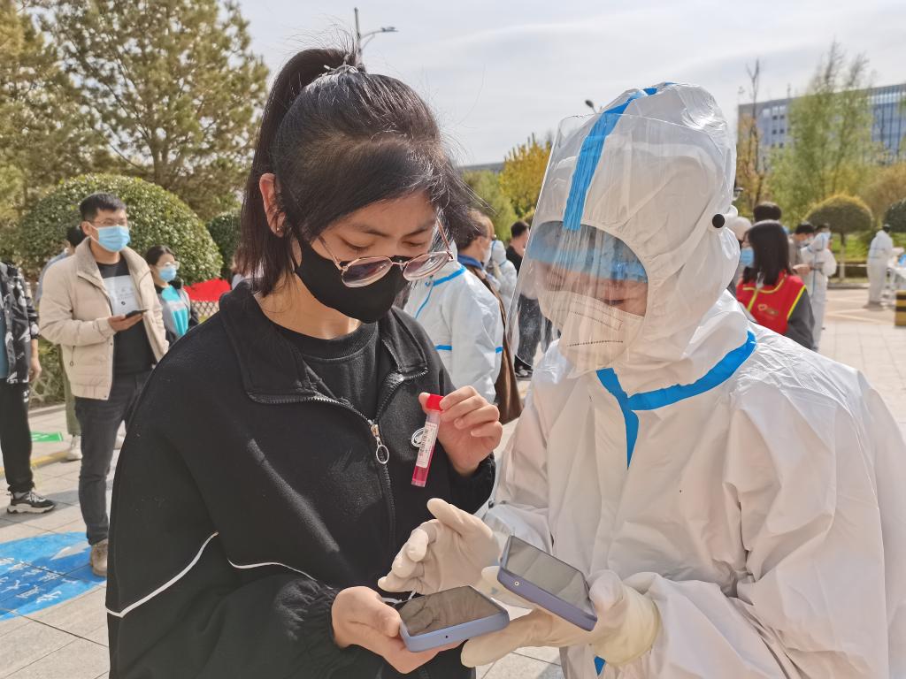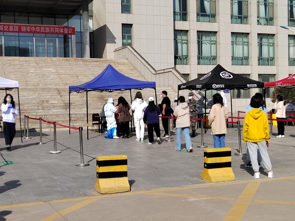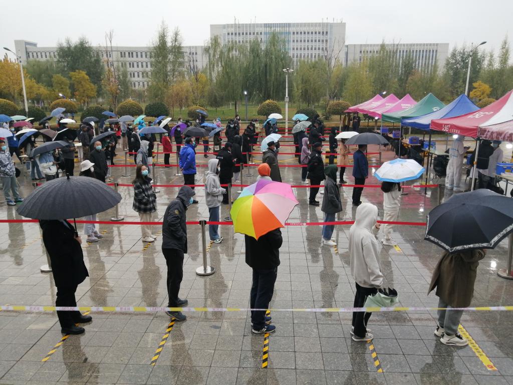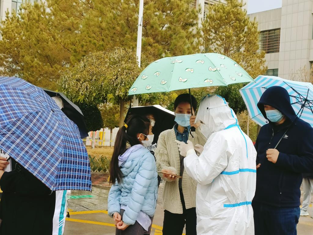 伴随着点点秋雨,疫情防控工作持续进行。学生志愿者引导同学们有序排队,提醒他们提前打开防疫健康码,维护现场秩序,帮助医护人员做好疫情防控工作,构筑起群防群治抵御疫情的严密防线。
