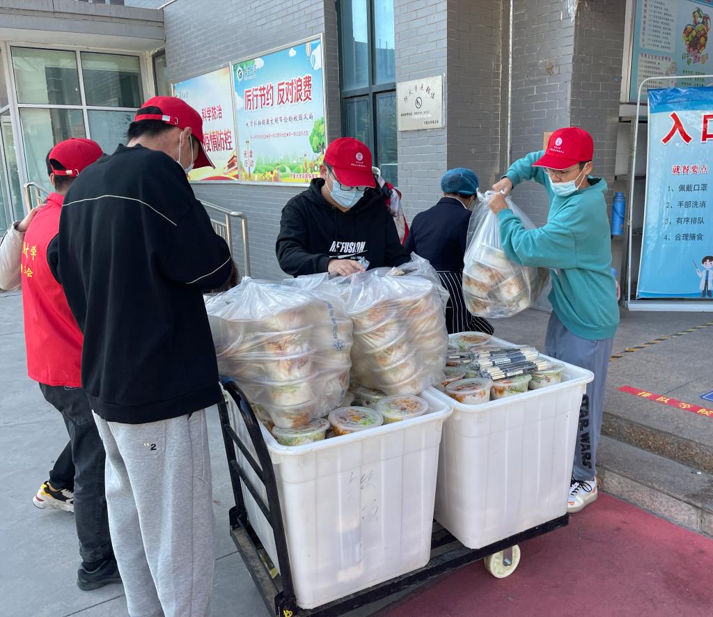 兰山公寓一号楼被封控后,楼外的同学们热情地帮助大家运送三餐,同时也提供购买生活必需品和物资、代取快递等服务,为大家的生活保驾护航,让大家安心地在宿舍生活学习。