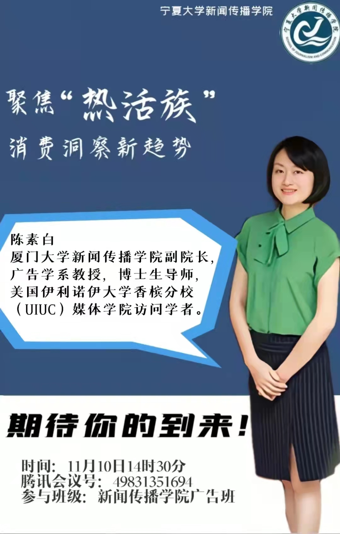 陈素白:中国青年品牌学者论坛理事会副理事长,AAA(AMERICANACADEMYOFADVERTISING)美国广告学会成员。2007年6月博士毕业于中国传媒大学广告学院,导师黄升民教授。2018.8-2019.8美国伊利诺伊大学香槟分校(UIUC)媒体学院访问学者,2010年“中国教育部第五期日本电通广告人才培养基金项目”访问学者。2015年获第三届“厦门大学我最喜爱的十佳教师”称号,2019年获厦门大学首批“唐立新优秀教学教师奖”。研究方向:消费变迁与广告文化,新媒体广告效果研究。