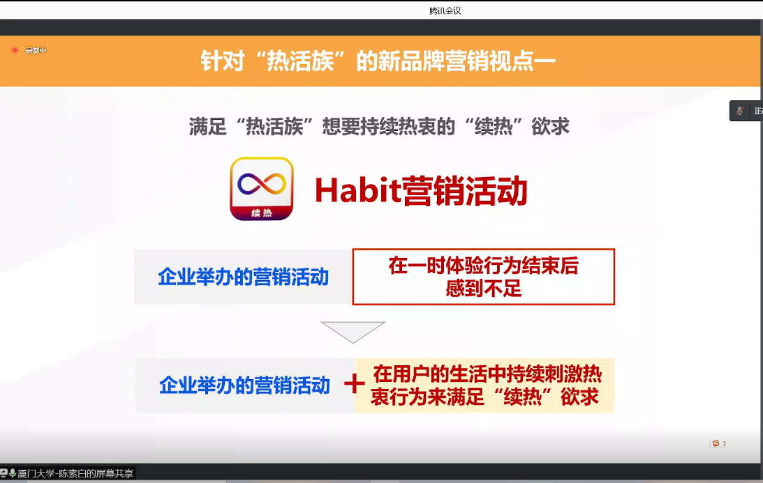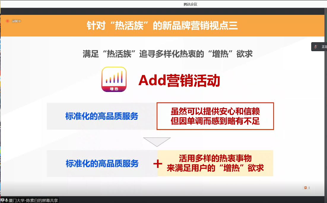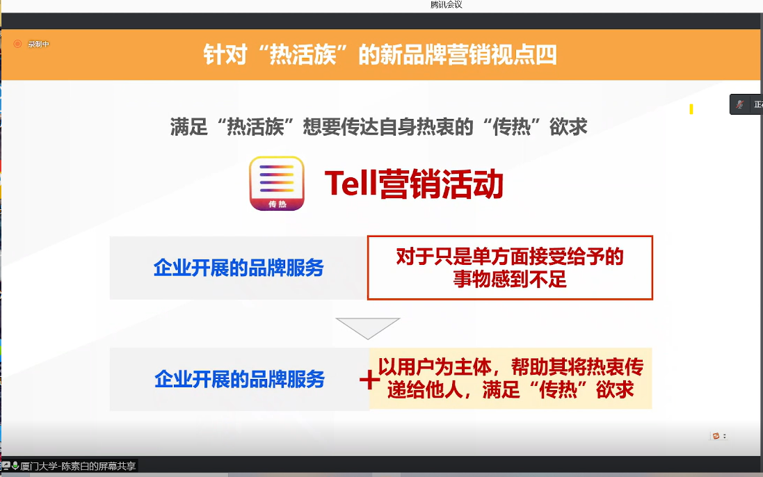 本次讲座,陈素白就身处时代变化潮流中生活者呈现出“年轻化”的趋势引出“热活族”概念,并针对这种趋势提出对应的市场营销视点,分析企业在时代潮流中,如何实现持续稳定增长。同时也探寻和深挖了生活者的“年轻化”意识并鼓励同学们朝着年轻化的趋势不断前进。