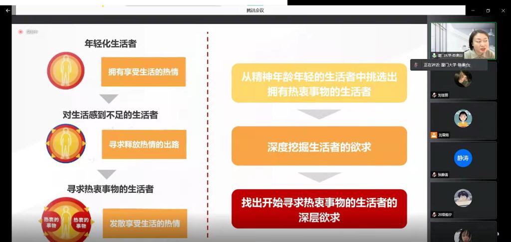 会议中,陈素白从三方面讲述了我们所处的“时代”——经济开始进入稳定增长期;科技生活所带动的消费热也趋于平静,以及人口构成逐渐少子老龄化,并伴随着这种时代的潮流变化,人们享受消费物质生活的热情降温;由于信息环境的变化与政府引导,人们享受生活的热情逐渐被激发,这种环境下“年轻化生活者”呈现出各年龄段都在广泛使用互联网,长时间使用手机的趋势。陈素白通过各类“年轻化”意识的调查报告和“年轻化”生活者的访谈来分析证实这种趋势,并以B站、抖音、微博多个社交平台的网络热图为同学们展示了——众多长者在对生活热情方面并不输年轻人,在生活者的眼中“年轻人”就是一种超越年龄限制充满活力的存在。针对老年人“年轻化”越来越普遍的现象,陈素白对“年轻人”与“年轻化”进行区分,并阐释了“热活族”这一概念。