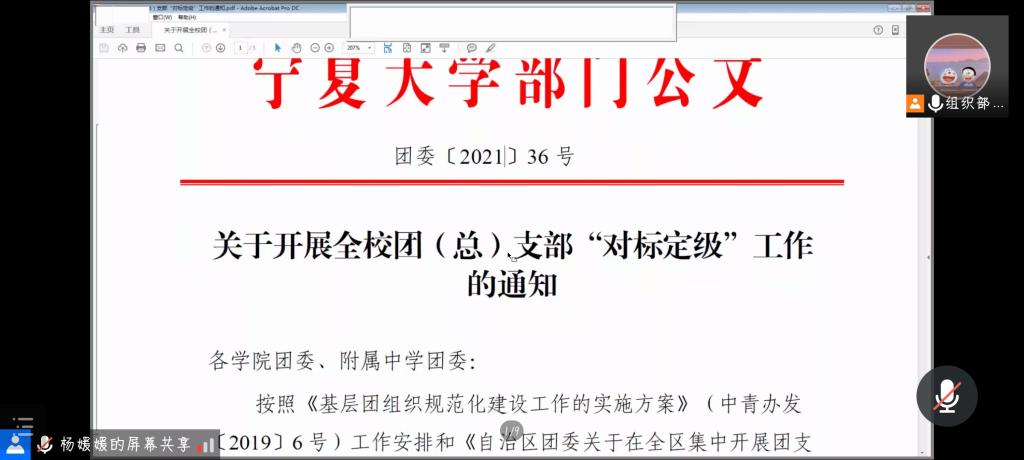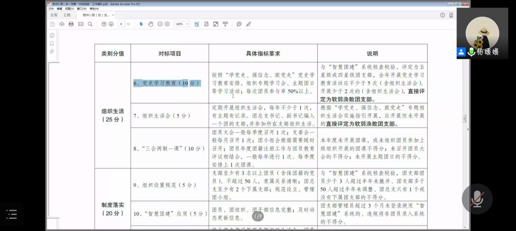 随后,杨媛媛对团支部对照参照标准进行了讲解。评定工作采取“五评,双签字”(评班子建设、评团员管理、评组织生活、评制度落实、评作用发挥,团支部书记、团员代表分别签字确认)的方式,同时兼以考察班子工作情况等相关评定标准,带动工作进行。她向各工作人员传达了加强组织领导,层层传达工作信号;坚持实事求是,准确如实开展评定;强化激励约束机制,突出定级结果运用;落实疫情防控要求,线上开展评定工作;及时录入系统,确保工作有序开展的五项要求。