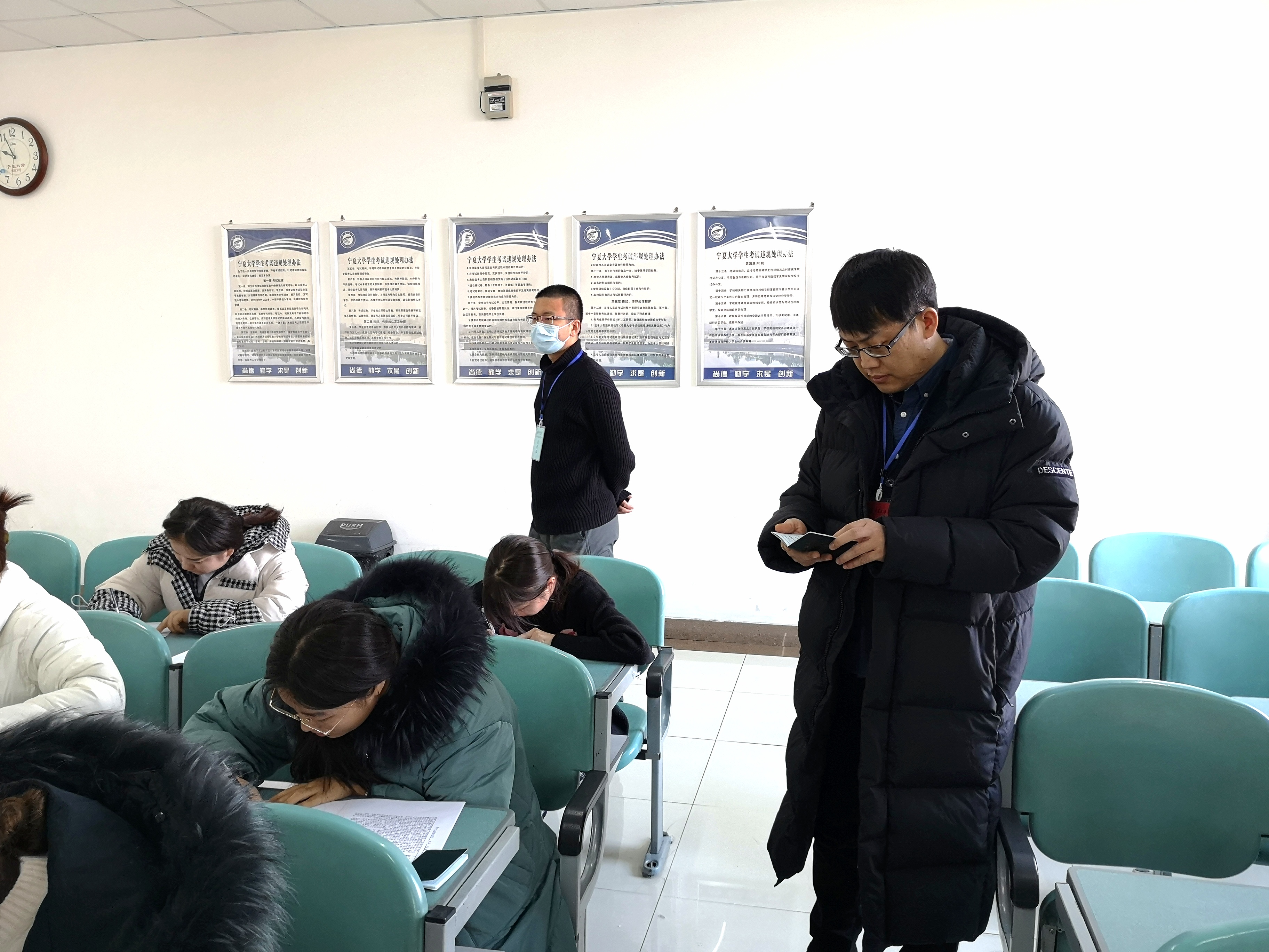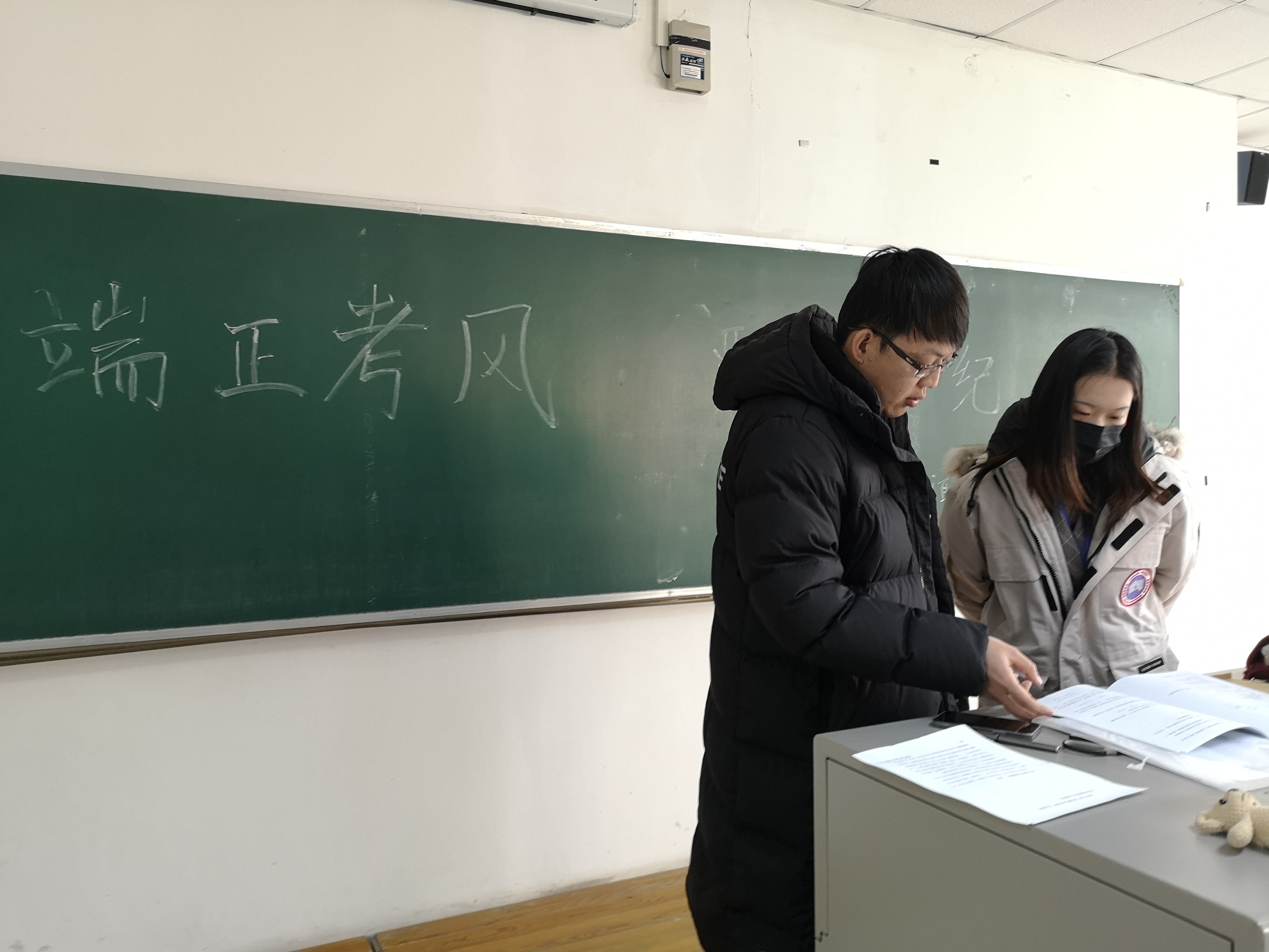我院于12月27日开始2021—2022学年第一学期专业课期末闭卷考试。为加强考试组织管理,强化考风建设、严明考试纪律,学院党总支书记潘瑞、执行院长李世举、学院教学督导于鹏亮、谢明辉及教科办教师雷双军进入考场开展检查巡视。
