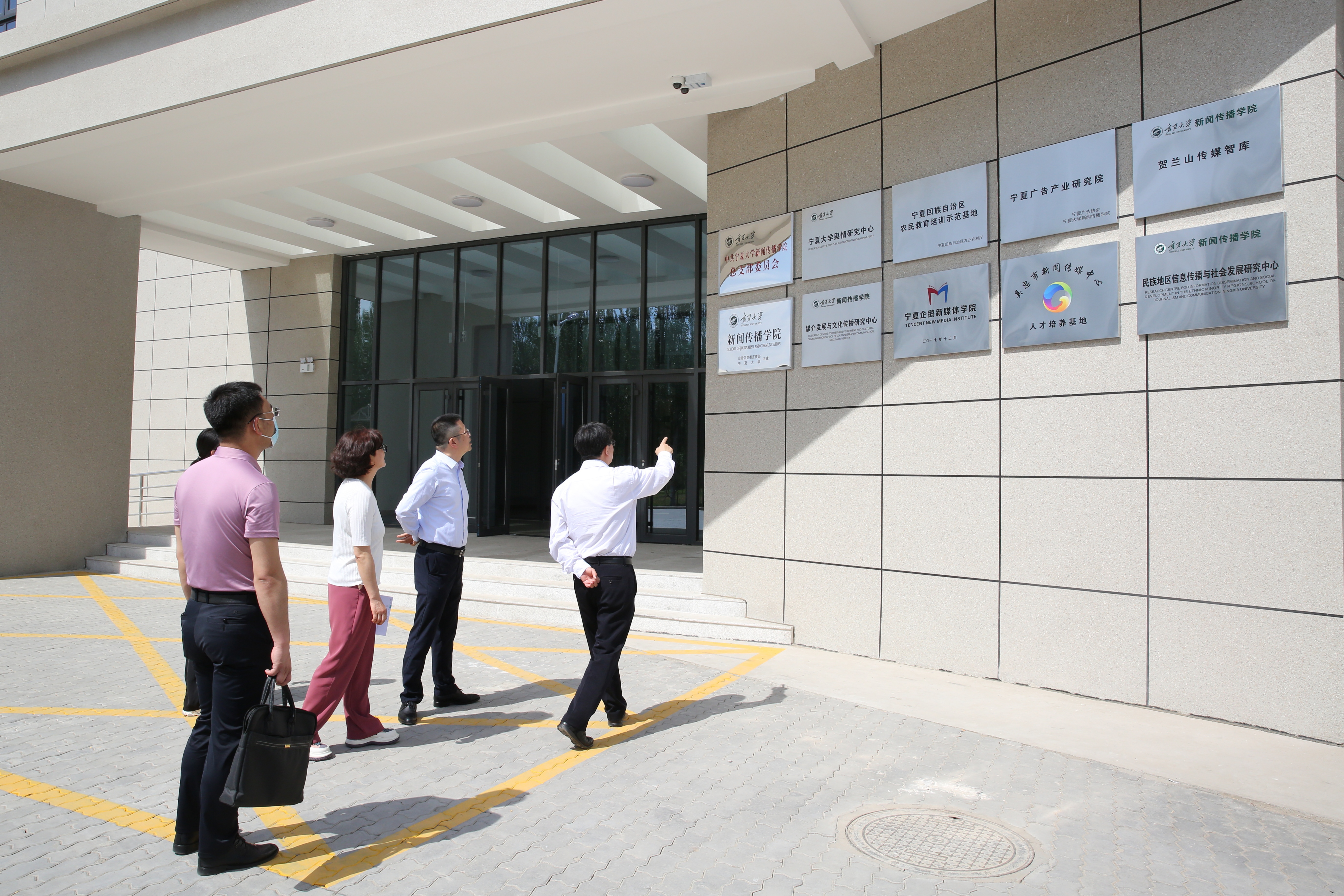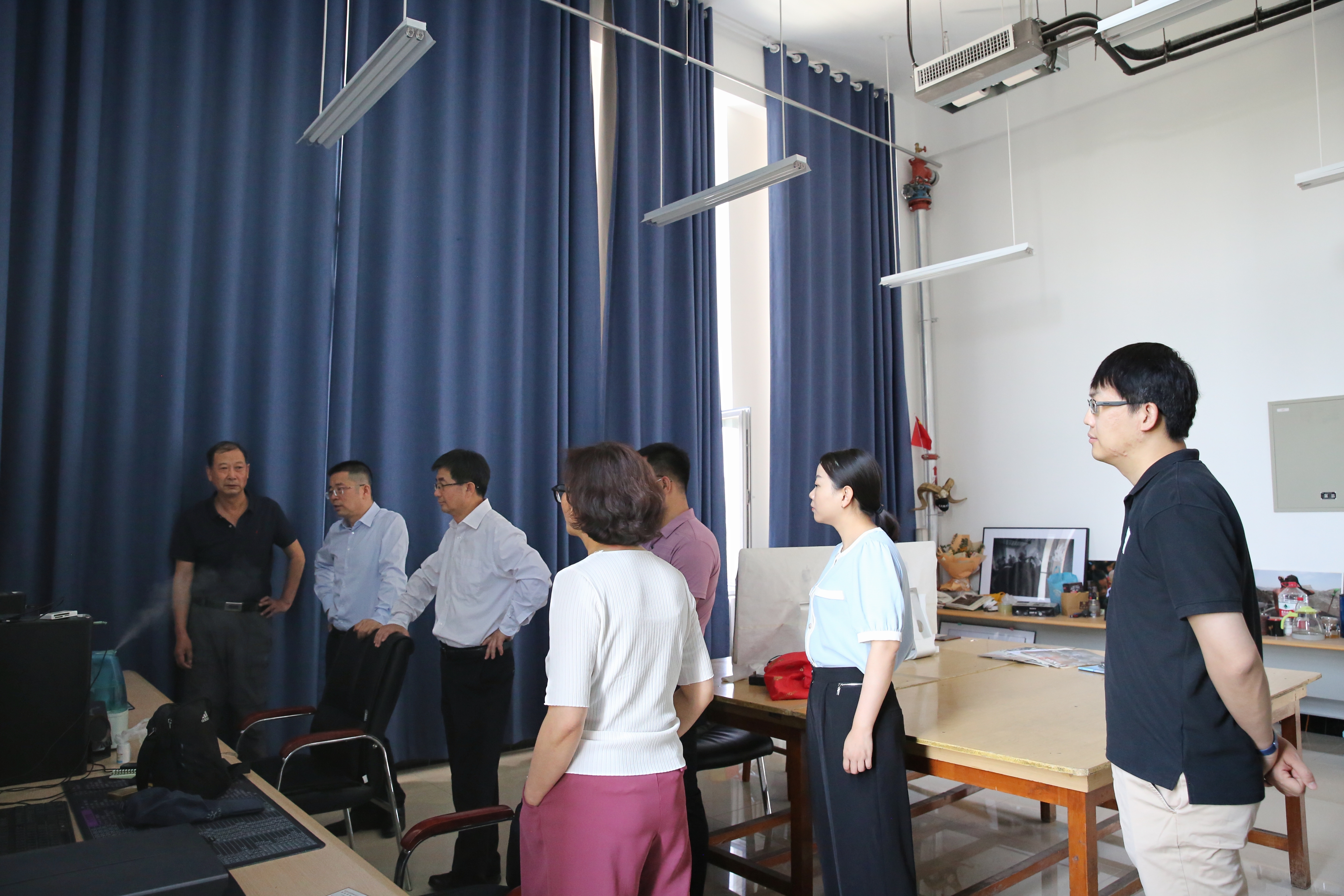 实验大楼,在摄影摄像工作室观看了邬志斌老师指导的毕业生作品,对实验实训中心、舆情中心、融媒体中心、演播厅、校园广播站、校园电视台及教师工作室的未来建设进行了全面了解。