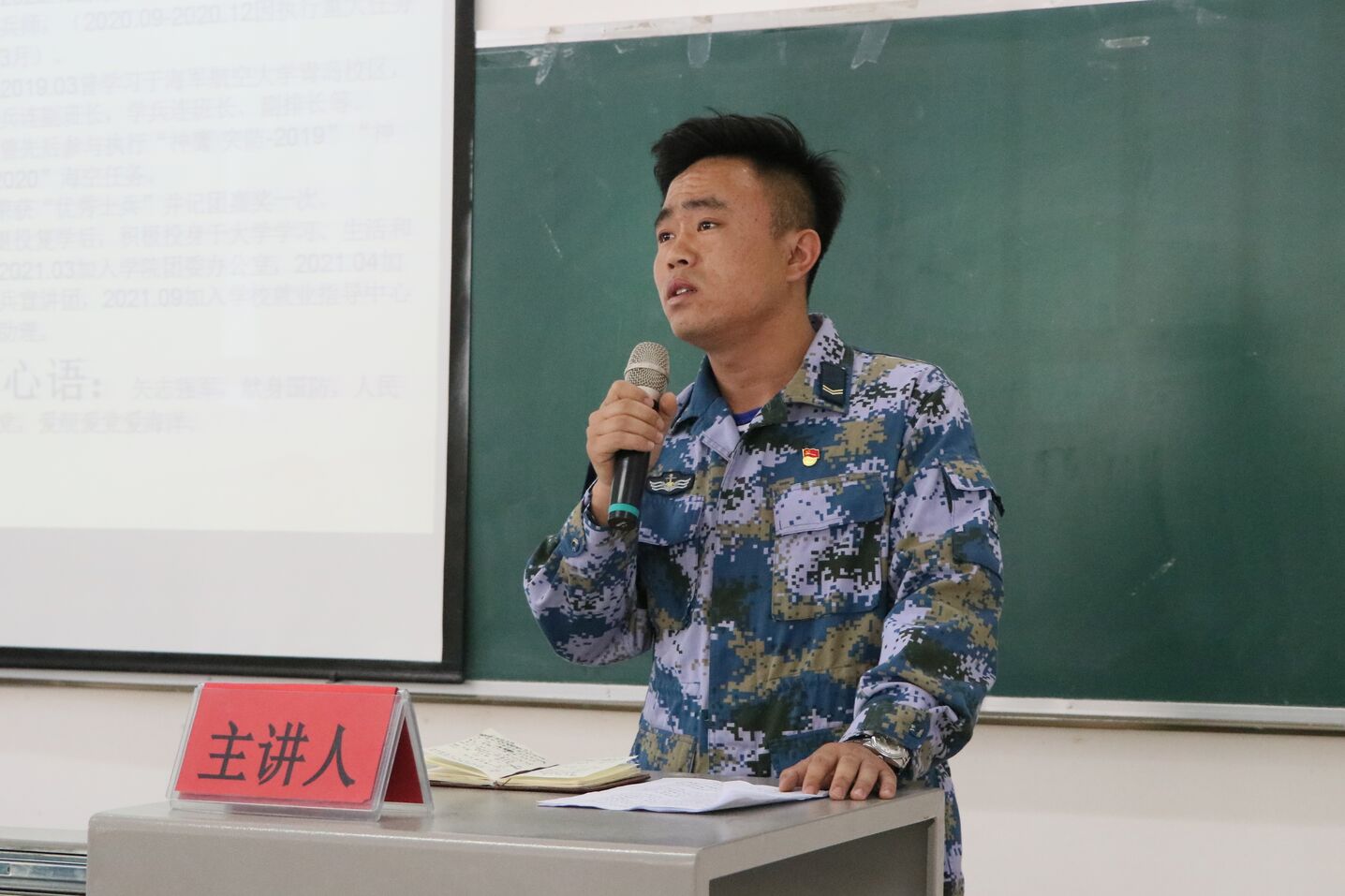 征兵宣讲团成员、2020级退伍大学生黑学虎主讲,2021级全体学生参加。