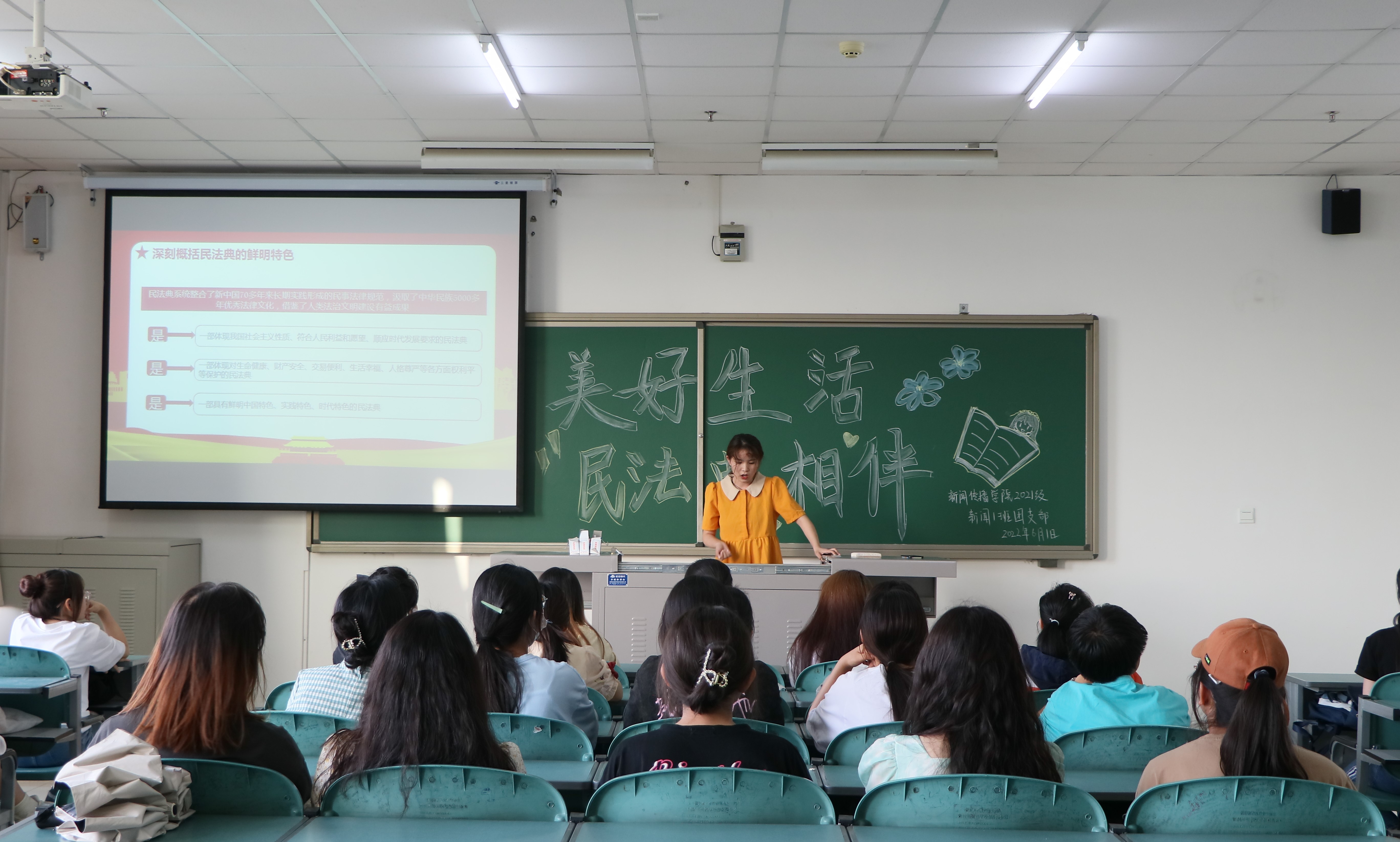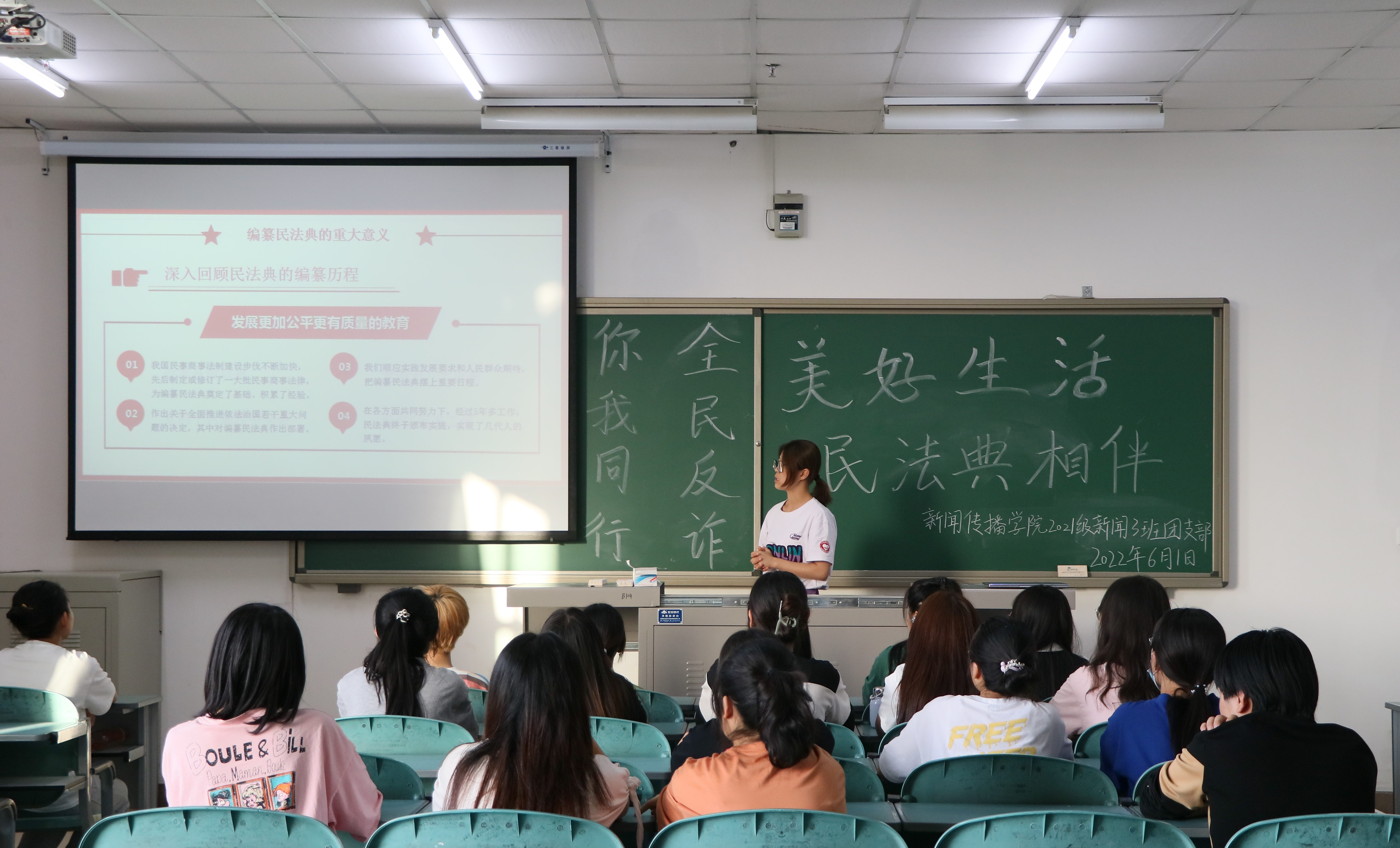 “从生老病死到衣食住行,从婚姻家庭到工作生活,我们的生活与《民法典》息息相关,学习《民法典》是每一个青年大学生的生活必修课。”2021级一班班长马丽元向同学们强调道。6月1日,我院于文荟楼开展以“美好生活 民法典相伴”为主题的团日活动,2021级全体同学参加。