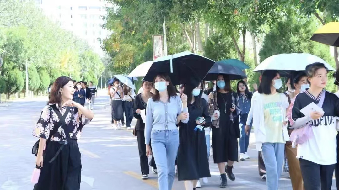 上午九点,三个小组于文萃校区智慧餐厅门口集合,在李鹏强、于晨曦、刘小舟三位学长的带领下游览校区。新生们先后参观了食堂、图书馆、大学生活动中心、操场、凌云广场、金波湖、孔子雕像等校园景观。于晨曦学姐向同学们详细介绍:“贺兰山校区的南大门正对着的雄伟建筑,是校园的主楼。学校的图书馆分别设立于文萃校区和怀远校区,同学们可以在那里漫游书海,也可以在众多自习桌中找到属于自己的学习天地。”