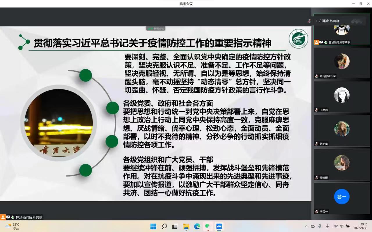 各班团支部书记主持班级活动,通过PPT展示、视频播放、感想交流等形式帮助同学们了解什么是冠状病毒、感染病例的症状、感染患者的临床表现以及预防新型冠状病毒感染的方法,号召同学们充分认识感染新型冠状病毒的危害并积极做好个人防护。2021级卓越人才新闻班团支部书记孙悦说:“大家要尽量少买或不买快递,严格遵守学校疫情防控规定,校园内务必须做到戴口罩,勤洗手,多通风,用实际行动共筑校园疫情防控安全屏障。”