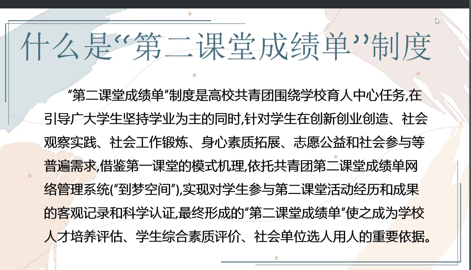 为加强新生了解“第二课堂成绩单”制度,10月6日晚,我院开展第二课堂制度新生线上培训会,第二课堂兼社团管理部门工作人员王艺瑾担任宣讲人,学生办公室主任雷丽霞及2022级全体新生应邀参会。