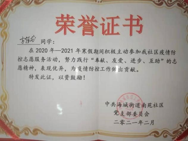 助力疫情防控,党旗所指即团旗所向,2020级卓越新闻传播人才班团支部在疫情防控期间,多次开展 “请党放心·强国有我·抗疫有我”的线上主题团日活动。支部组织支部成员参与志愿服务活动,积极配合校园疫情防控要求;不少同学利用寒暑假主动投入社区疫情防控工作,志愿服务的同时坚定了入团、入党初心。