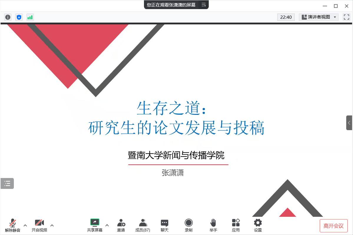 11月23日,我院邀请暨南大学新闻与传播学院张潇潇教授开展《生存之道,研究生论文发展与投稿》线上前沿讲座,学院副院长张静涛教授主持讲座,新闻系全体研究生、部分本科生聆听了讲座。