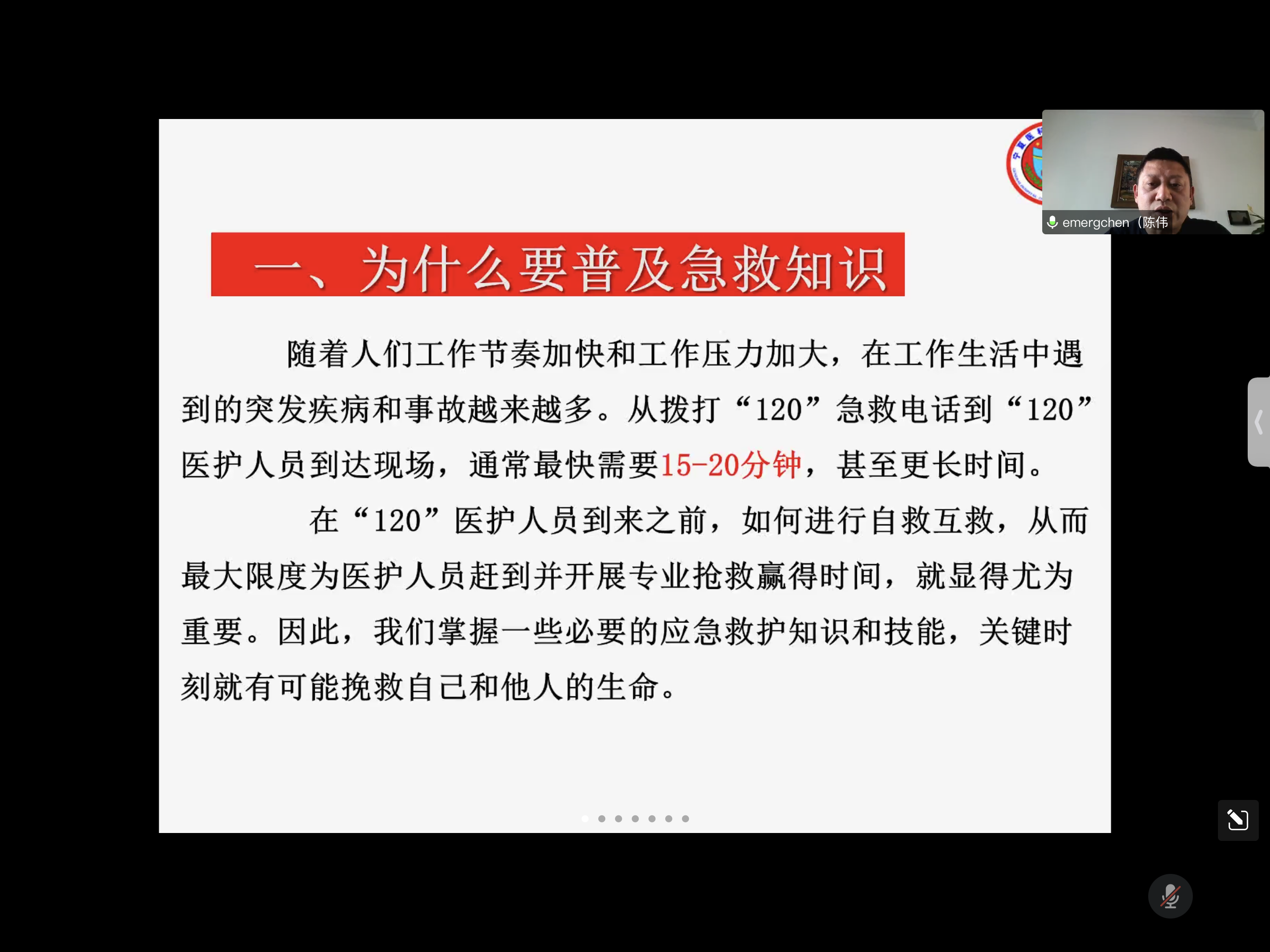 陈伟从近年来越来越多的突发疾病和事故事实引入,解释了普及急救知识的原因,表明学习应急救护对个人生命安全、对公共卫生应急管理的重要意义。陈伟科普了多种常见急症、意外伤害和自然灾害的相关知识及救助方法。他强调,救助者本人须保持冷静,坚持“先救命后治伤”、“先救重后救轻”和“救护与呼救并重”的三项原则,确保应急救护起到真正的作用。