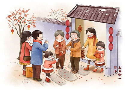 古时“拜年”一词原有的含义是为长者拜贺新年。拜年一般从家里开始。初一早晨,晚辈起床后,要先向长辈拜年,祝福长辈健康长寿,万事如意。长辈受拜以后,要将事先准备好的“压岁钱”分给晚辈。在给家中长辈拜完年以后,人们外出相遇时也要笑容满面地恭贺新年,互道“恭喜发财”、“四季如意”、“新年快乐”等吉祥的话语,左右邻居或亲朋好友亦相互登门拜年或相邀饮酒娱乐。