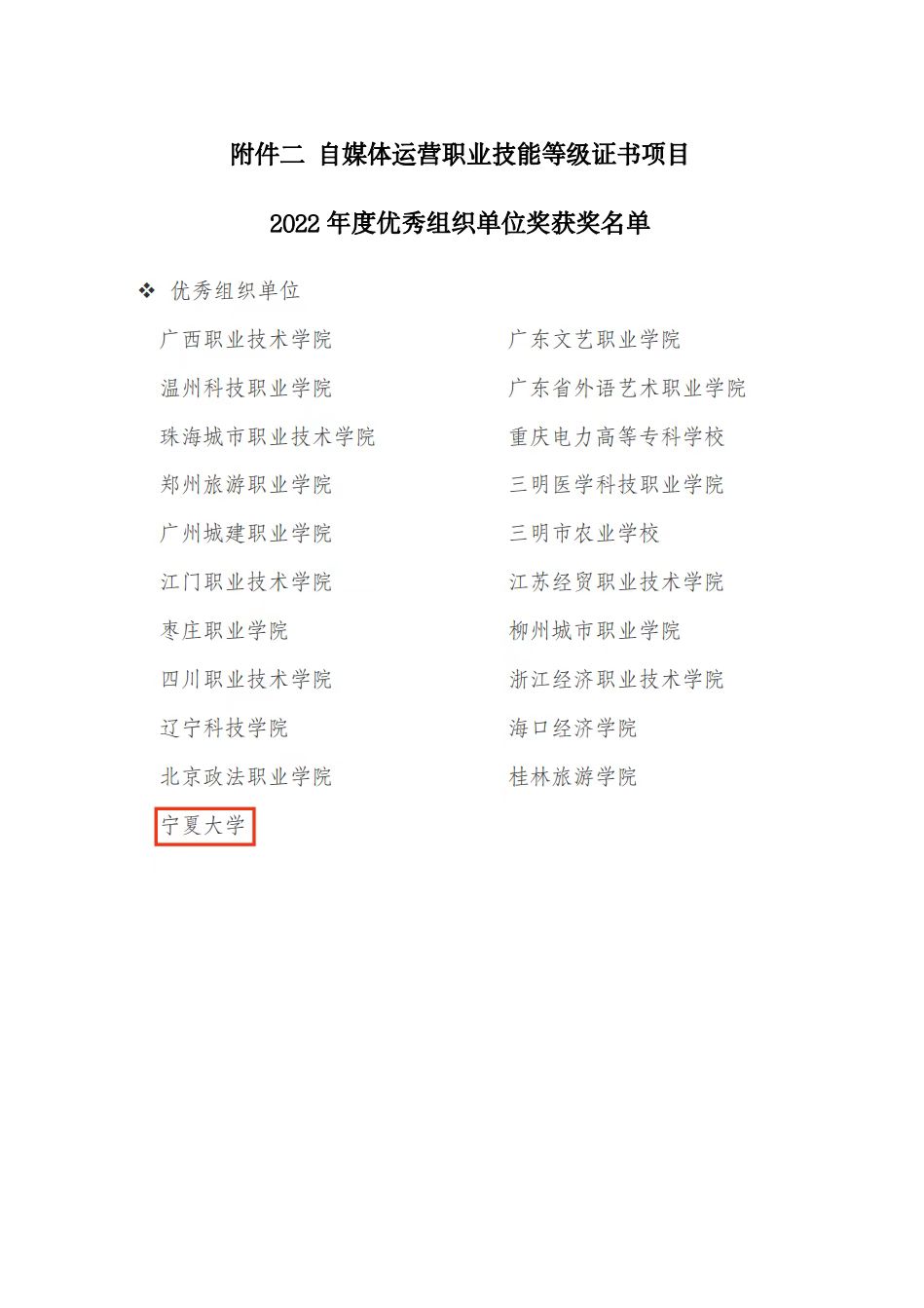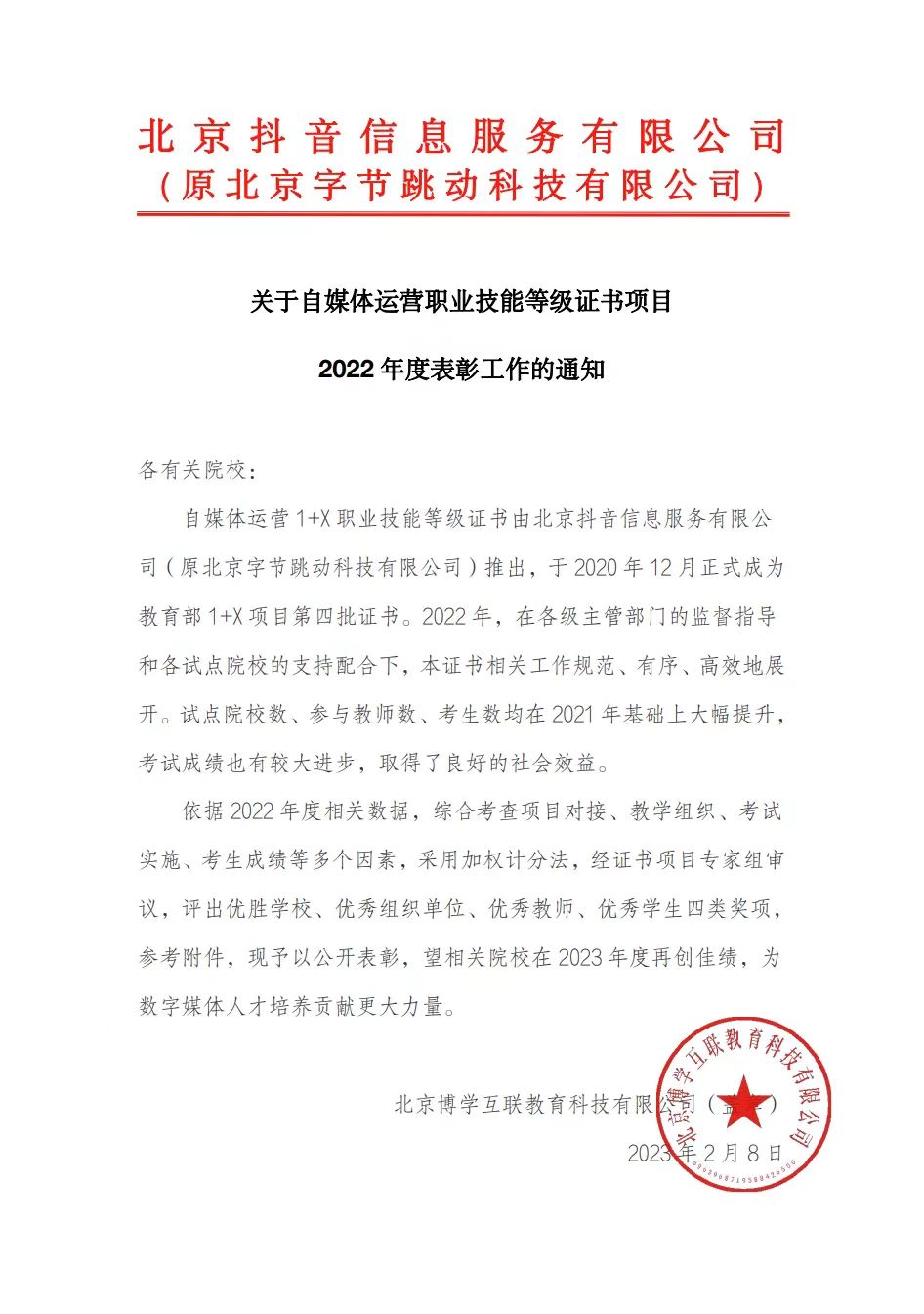 自媒体运营1+X职业技能等级证书是教育部、国家发展改革委、财政部、市场监管总局联合发起,由北京抖音信息服务有限公司(原北京字节跳动科技有限公司)认定,将产业需求和职业标准相结合,从业者能力与职业技能标准相衔接的含金量证书。此项目依据2022年度相关数据,综合考查项目对接、教学组织、考试实施、考生成绩等多个因素,采用加权计分法,经证书项目专家组审议,评出优胜学校、优秀组织单位、优秀教师、优秀学生四类奖项。