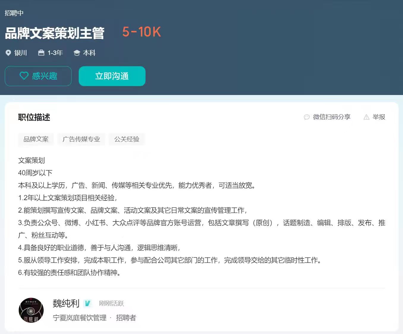 岗位:品牌文案策划主管