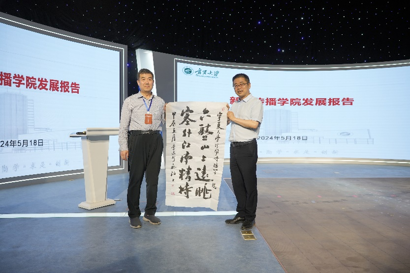 教授李建新赠上其亲笔题词的书法作品,并阐释“六盘山上远眺 塞上江南精持”的寓意,希望91视频