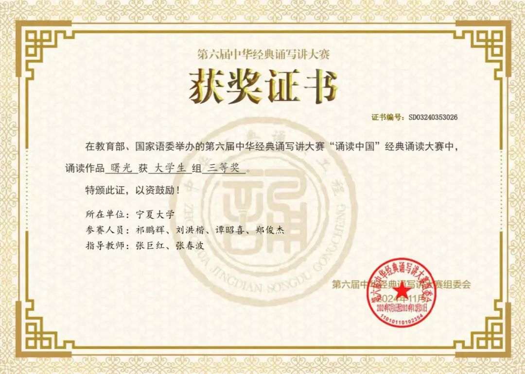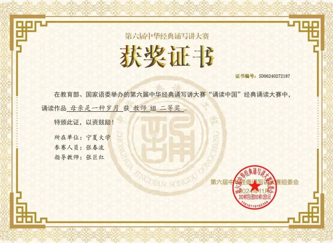 近两届来,我院在该赛事上突破了国家级大奖。上一届大赛中,我院学生诵读作品最终荣获大学生组一等奖,一举实现了宁夏五届以来大学生组没有一等奖的历史性突破。两年来的成绩,是学院在铸牢中华民族共同体意识方面的具体实践。