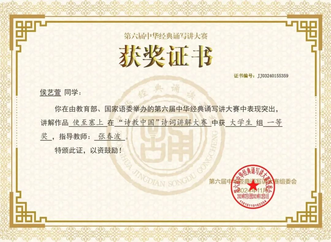 近日,第六届中华经典诵写讲大赛圆满落幕。我院学生侯艺萱在“诗教中国”诗词讲解大赛中获得大学生组一等奖,我院教师张春波在“诵读中国”诵读大赛中获得教师组二等奖,我院学生祁鹏辉、刘洪楷、谭昭喜、郑俊杰在“诵读中国”诵读大赛中获得大学生组三等奖,我院学生张佳楠在“诗教中国”诗词讲解大赛中获得大学生组优秀奖。