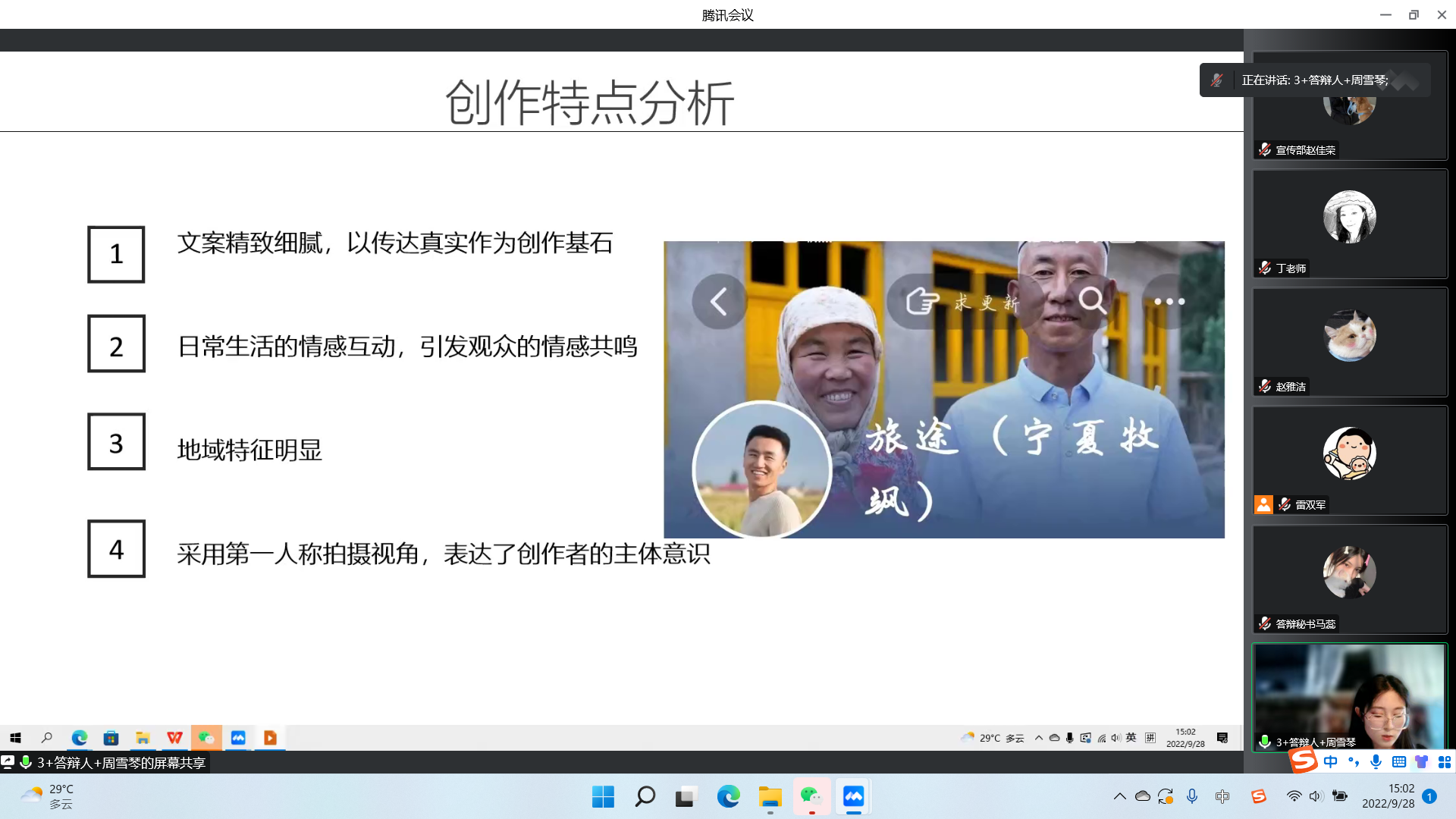 各小组答辩人分别从项目进展、存在问题、下一步工作计划、经费使用情况等方面展开阐述。答辩学生思路清晰、发言流畅,成果展示良好。“探索宁夏地区美食品牌传播新模式”项目组立足于吴忠早茶在品牌传播上的痛难点问题,以实现进一步传播吴忠早茶文化、推广当地特色饮食为目标,产出新媒体产品在各平台进行投放和品牌传播;周雪琴项目组以“旅途(宁夏牧飒)”抖音号为例,对乡村生活纪实类短视频进行研究;王燕项目组聚焦贺兰山腹地的石炭井,对此地区的历史背景、人文情怀、搬迁故事进行详尽调研,致力推进纪录片《石炭井纪事》的拍摄。评委老师们从结题要求、结题报告要求、作品的核心观点、拍摄意义、完成后的去向以及如何发挥作品最大价值等问题进行了分析点评。