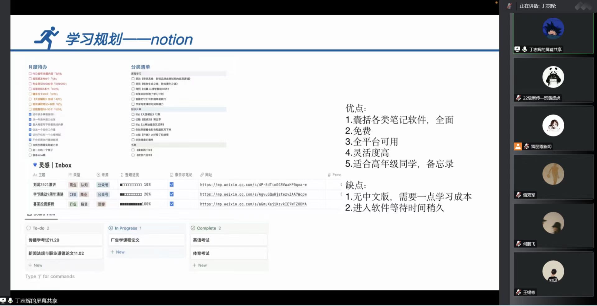 丁志辉向同学们详细介绍了一些学习软件,从时间管理与学习计划的角度,分享了自已使用学习软件的经验,为同学们在疫情线上学习期间合理分配时间提供了一种高效的途径。