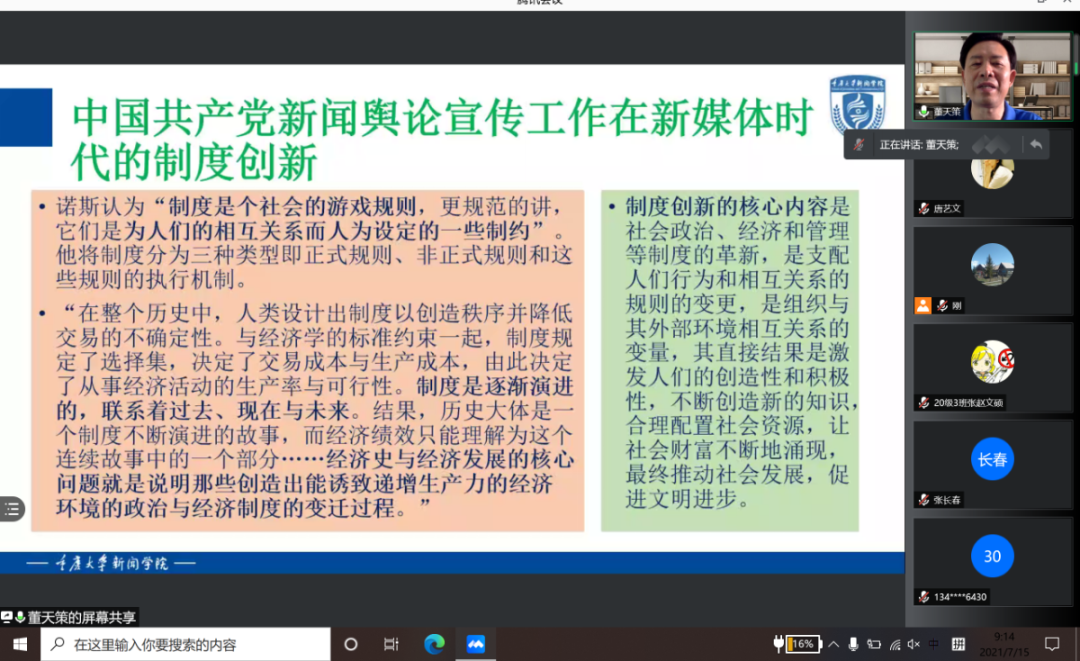 本次培训会议的主题为“中国共产党新闻舆论宣传工作在新媒体时代的制度”。董天策先从媒体、经济、政治三个角度全面阐释了新媒体时代到来的缘由,随后,他向大家解释了制度创新的核心内容,并从舆论监督纳入党内监督条例,保障公民知情权、表达权、参与权、监督权,《政府信息公开条例》的颁行,《互联网新闻信息服务管理规定》施行与修订,推动媒体融合发展五个方面展开详细论述。同时他结合“非典”疫情和汶川地震等重大社会突发事件,细致梳理上述制度和条规从制定到发展完善的时间线,解释专业词汇的具体含义,并强调了制度变革对新闻工作产生的种种新要求和新责任。