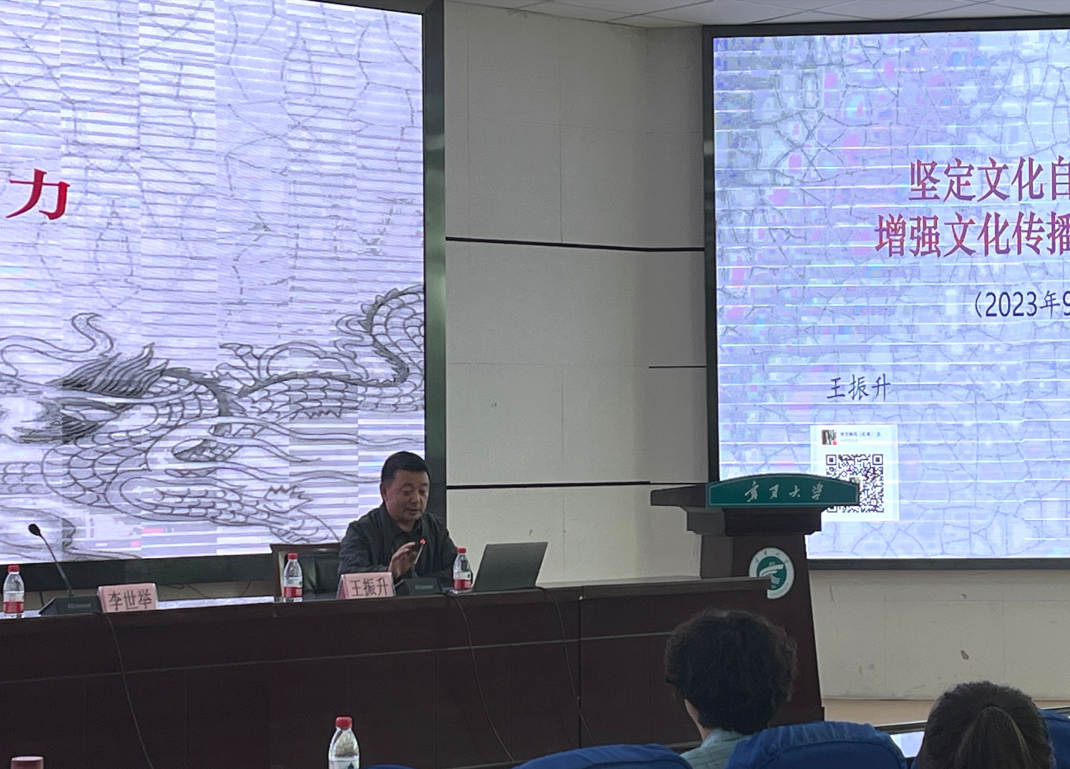 为学习贯彻习近平总书记在文化传承发展座谈会上的讲话精神,增强新闻专业学生与新闻工作者的文化自信和传统文化素养,9月20日下午,由自治区党委宣传部主办、宁夏新闻工作者协会、自治区网信办、宁夏91视频 、宁夏新闻培训中心联合承办的第八期全区马克思主义新闻观培训讲座顺利举行。本次培训有幸邀请到了著名文化学者、自治区纪委委员、驻自治区党委宣传部纪检组组长王振升老师进行主讲,讲座的主题为《坚定文化自信自强 增强文化传播力影响力》。91视频 李世举教授主持,全区各媒体机构的新闻工作者代表及我院部分师生200余人参加。